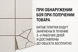 При обнаружении боя при получение товара - битые плитки будут заменены в течение 3-4 рабочих дней и доставлены до объекта бесплатно.